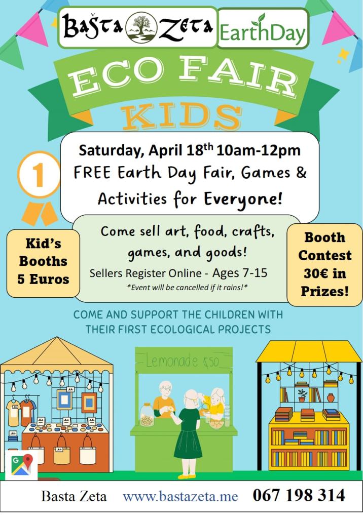 This will also include a booth competition where children can win a prize for the best eco-art booth! Children Ages 5-15 can register here. Booths must be set up by 9:45am on April 18th to be in competition! This will require a 5 euro fee and will receive a 3×2 meter space. We are only allowing 20 sellers this year. and you must bring your own table or blanket! Registration Link or DM Andrea Directly by April 16th!